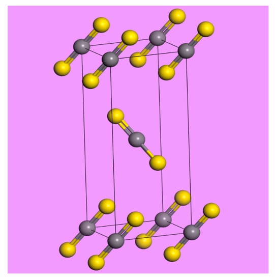 The primitive unit cell of carbon disulfide. Grey = carbon, yellow = sulfur.