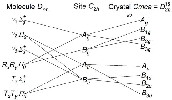 In the solid state, the crystal is orthorhombic (Cmca) with two molecules in the primitive unit cell, both on sites of C2h symmetry [,]; see Figure 1. Figure 2 shows the correlation diagram for CS2 and that, at the Γ-point in the Brillouin zone (where the infrared and Raman active modes occur), the modes comprise: