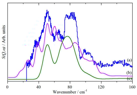 The translational mode is much more problematic. The calculations, Figure 4a, show that this is strongly dispersed, so it does not result in a single feature in the INS spectrum. The calculated value of 52 cm−1 at the Γ-point is slightly higher than the 37 cm−1 measured close to the melting point of CS2 [], but the latter is likely to be severely affected by anharmonicity.