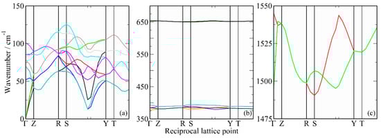 Figure 4 presents a detailed comparison of the observed and calculated INS spectra in the low energy region. It is evident that there is a considerable difference between the full dispersion calculation, 4b, and the Γ-point only calculation, 4c, demonstrating that there is significant dispersion present, as seen for the acoustic modes by inelastic coherent neutron scattering from a single crystal []. The calculated dispersion curves are shown in Figure 5. It can be seen that all of the modes in the region below 150 cm−1 exhibit significant dispersion, which makes the association of specific features in the INS spectrum, in this region, with a particular mode meaningless. The “missing” translational mode is calculated to be at 52 cm−1 at the Γ-point, but disperses over the range 20–80 cm−1; thus, it makes a contribution to the structured peak at 51 cm−1, but this also includes significant contributions from acoustic translational modes. This is apparent from the additional peaks at 26 and 39 cm−1 in the full dispersion calculation, 4b, that are absent in the Γ-point only calculation, 4c, as the acoustic modes have zero energy at the Γ-point, Figure 5a.