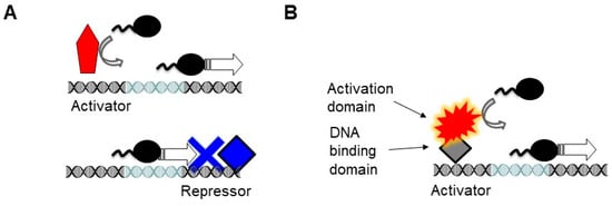 - Brent, R.; Ptashne, M. A eukaryotic transcriptional activator bearing the DNA specificity of a prokaryotic repressor. Cell 1985, 43, 729–736. [Google Scholar] [CrossRef]