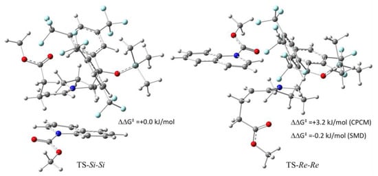 As high enantioselectivities (>85% ee) were generally observed by other authors using oxoesters 1a,b as the nucleophilic component in aldol and Michael reactions [10,11,12,13,14], we initially surmised an epimerization of the exocyclic stereocenter in our Mannich-type reaction. However, a closer examination of the reaction of N,O-acetal 2a with oxoester 1b in the presence of L1 and L2 showed not significant variations during time. Even after 5 min the product distribution was roughly the same as reported in Table 1 and did not have substantial changes during time, thus pointing to a stereochemical outcome under kinetic control. This unexpected and particular stereochemical result was studied in detail by computational calculations (Figure 2). Considering that with aliphatic aldehydes the syn-1,2-addition products were the major diastereoisomer and showed higher enantiomeric excesses than anti-addition products, in order to simplify computational calculations we decided to examine in detail only the syn-1,2-addition pathway using organocatalyst L2. The enantiomer excess calculated with conductor-like polarizable continuum model CPCM solvation for toluene (56% ee) was in very good agreement with the experimental results (entries 2 and 3, Table 1). In our hypothesis, the presence of the polar ester group (in particular the OMe moiety) made the chain able to give electrostatic interactions with trifluoromethyl groups and with C1 (“ex carbonyl”), both in the Si face (TS-Si-Si, Figure 1) and in the more hindered Re face of the organocatalyst (TS-Re-Re). The same interaction, both steric and electrostatic in nature, occurred also with the carbamate group of N-acyliminium ion. In other words, the polar chain was a “mimic” of the N-acyliminium ion and vice-versa. Actually, the estimated ΔΔG† difference calculated with CPCM, and solvation model based on density (SMD between TS-Si-Si and TS-Re-Re was only +3.2 kJ/mol (Si-Si/Re-Re = 78/22) and −0.2 kJ/mol ((Si-Si/Re-Re = 48/51), respectively, with the consequent partial loss of the high stereoinduction usually given by bulky substituent of organocatalyst L2 with simple aliphatic aldehydes [20].