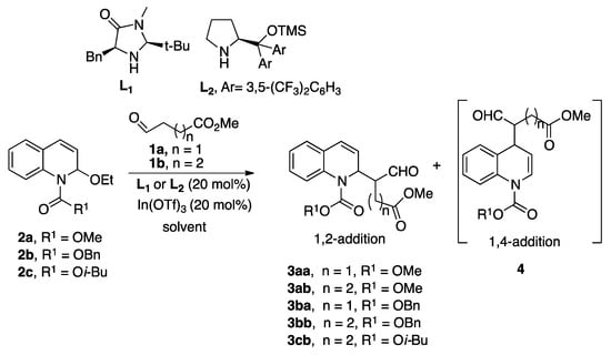 Acyl Mannich-type reactions, by the combination of simple aminocatalysts and metal catalysts, have been recently developed with aliphatic and α,β-unsaturated aldehydes by our research group [20,27,28]. Since our experience in this field, we have always noticed that MacMillan catalyst L1 and Hayashi–Jørgensen catalyst L2 showed the best performances in tetrahydrofuran (THF) and toluene, respectively (Scheme 2). In our studies using cooperative dual catalysis we had observed that the combination with different Lewis or Bronsted acids influenced to some extent the reactivity and stereoselectivity depending on the substrate used. As the reactions with aliphatic aldehydes gave similar and optimal results in term of rate, region, and stereocontrol when indium triflate [In(OTf)3] was employed with both imidazolidinone catalyst L1 and prolinol organocatalyst L2 this salt was used as catalysts for the reaction of aliphatic oxoesters 1a,b.