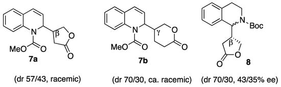 After chromatographic purification, the reduction of the newly obtained oxoesters 3aa, 3ab, and 6a with NaBH4 gave spontaneously new heterocyclic δ- and γ-lactones 7a,b and 8 as the major products (Scheme 4). Functionalized γ- and δ-lactones are valuable compounds found in a large variety of natural and synthetic biologically active substances and many efforts have been devoted to their synthesis in non-racemic form [30,31]. In particular, chiral γ-butyrolactones having an aryl group at β-stereocenter are of considerable importance in themselves and as key precursors to the synthesis of γ-aminobutyric acid derivatives [32,33,34]. While the enantioselective introduction of the aryl moiety at the β-position has been accomplished by asymmetric conjugate addition [35,36,37], or Heck–Matsuda coupling [38], the introduction of nitrogen heterocycles remains challenging [39]. Furthermore, to the best of our knowledge, the introduction of a heteroaryl moiety into the γ-position of a δ-lactone also in a racemic fashion is unprecedented. Our approach gives the possibility of a streamlined introduction of a heteroaryl moiety into the γ-position of a δ-lactone and into the β-position of a γ-lactone. However, the poor stereocontrol obtained for their formation, especially for dihydroquinoline derivatives, points to an unwanted epimerization during the reduction/lactonization process (Scheme 4).