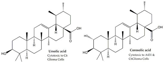 Saurauja roxburghii, belonging to the Actinidiaceae family, was assessed for cytotoxic activity. Ursolic acid and corosolic acid (Figure 1), obtained from the plant, were tested for cytotoxicity against A431 human epidermoid carcinoma and C6 rat glioma cell lines. Corosolic acid was effective against both cancer cells, while ursolic acid was cytotoxic against C6 glioma cells [20,21].