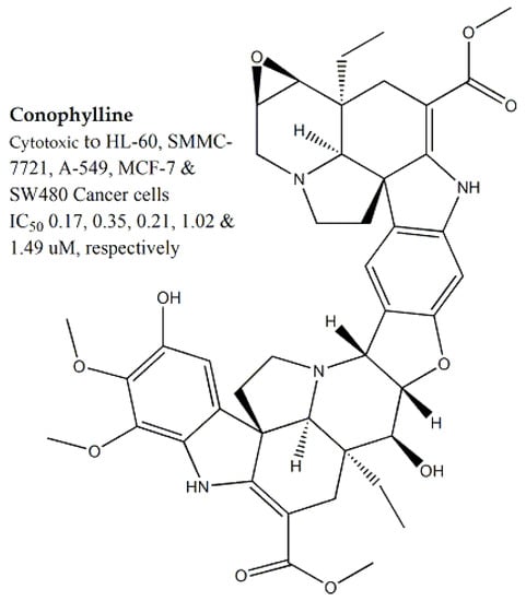Tabernaemontana divaricate, belonging to the Apocynaceae family, was investigated for its cytotoxic potential against NIH3T3 and HeLa cell lines and the respective IC50 values were >100 μg/mL and 35.3 μg/mL, respectively. Several alkaloidal cytotoxic compounds i.e., ervachinine, cononitarine, conofoline, conophylline and cisplatin were also reported, among which conophylline (Figure 2) was found to be most potent against HL-60 (human Caucasian promyelocytic leukemia), SMMC-7721, A-549, MCF-7, and SW480 cell lines (IC50 values of 0.17, 0.35, 0.21, 1.02, and 1.49 μM, respectively) [29,30].