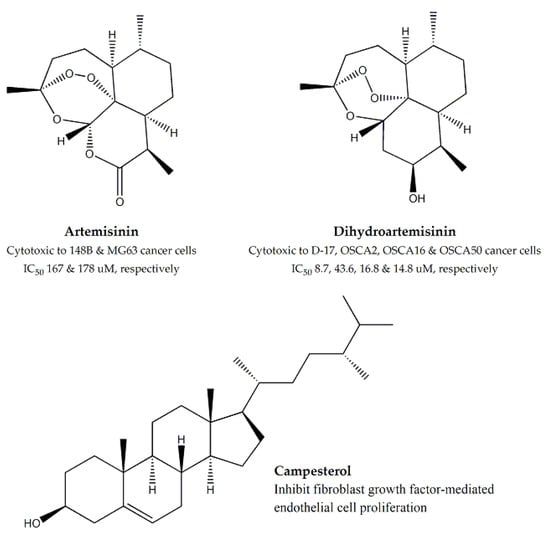 Artemisinin (Figure 4), the designated phytoconstituent of Artemisia annua, was reported to be active against two human osteosarcoma cell lines, 148B and MG63 (IC50 values were 167 μM and 178 μM, respectively) [37]. Dihydroartemisinin (Figure 4), a derivative of the compound was evaluated against canine OSA (Osteosarcoma) cell lines, D-17, OSCA2, OSCA16, and OSCA50 and the respective IC50 values were 8.7, 43.6, 16.8 and 14.8 μM [38]. Apart from this, other bioactive compounds of A. annua were also tested by evaluating the cytotoxicity of its hydro-alcoholic, dichloromethane, and methanol extracts against D-17, HeLa, and TC221 cell lines, and a dose- dependent anticancer activity was observed [39,40]. For Bidens pilosa, different fractions of whole plant were evaluated, using the MTT and Comet assays, against HeLa and KB cell lines. The chloroform fraction was found to be most effective against KB cells, while the water fraction was most active against HeLa cells, with CC50 values (concentration of the sample tolerated by 50% of the cultures exposed) of 88.6 and 372.4 µg/mL, respectively [41]. Aerial parts of both Centaurea antiochia and Centaurea nerimaniae were evaluated against Vero and HeLa cell lines and showed moderate cytotoxicity against Centaurea antiochia and significant cytotoxicity against Centaurea nerimaniae [23,42].