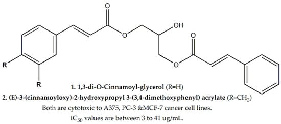 Tillandsia recurvata was evaluated against A375 (human melanoma), MCF-7, and PC-3 cell lines (IC50 values were 1, 40.5 and 6 μg/mL, respectively). Two bioactive dicinnamates i.e., 1,3-di-O-cinnamoylglycerol and (E)-3-(cinnamoyloxy)-2-hydroxypropyl 3-(3,4-dimethoxyphenyl) acrylate (Figure 5) were also isolated from the plant. Both of them exhibited activity against A375, PC-3 and MCF-7 cell lines, with IC50 values ranging between 3 to 41 μg/mL, respectively [53].