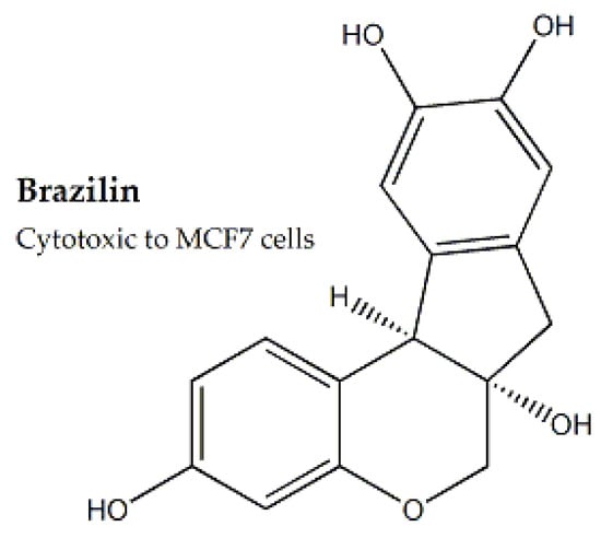 Heartwood and leaf extracts of Caesalpinia sappan were examined for cytotoxic potential against MCF-7 and A-549 cell lines. Brazilin A (Figure 6) was also isolated and evaluated against MCF-7. Significant cytotoxic property was observed for both crude extracts and bioactive compound. Further molecular docking proved the effectiveness of Brazilin A in the reduction of Bcl-2 apoptotic inhibitor [54]. Saraca asoca (Caesalpiniaceae family) was reported cytotoxic against AGS cell lines (IC50 value: 20 μg/mL). Further evaluation of the bioactive compounds was recommended [24].