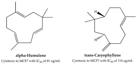 Lavandula angustifolia, belonging to the Lamiaceae family, was found to have negligible or no activity against MCF-7 and Hep-2 cell lines [22]. On the other hand, Plectranthus stocksii stem and leaf extract was significantly cytotoxic against RAW264.7, Caco-2, and MCF-7 cell lines. The least IC50 value for RAW264.7 was 9 mg/mL (stem ethyl acetate fraction), for Caco-2 it was 36.1 mg/mL (leaves ethyl acetate fraction), and for MCF-7, it was 48.9 mg/mL (leaf ethyl acetate fraction) [61]. For Salvia hypargeia, cytotoxic activity was examined against Vero and HeLa cell lines and the IC50 values were over 1000 µg/mL against both cell lines [23]. In contrast, Salvia officinalis was found to be significantly cytotoxic against MCF-7, B16F10, and HeLa cells (IC50 = 14–36 µg/mL). Two bioactive compound i.e., α-humulene and trans-caryophyllene (Figure 7) were also isolated and tested against MCF-7 cell line and the IC50 values were found to be 81 and 114 μg/mL, respectively [62]. the aerial parts of Teucrium sandrasicum were examined for cytotoxic effects against HeLa and Vero cell lines and the reported IC50 values were 513 and 593 µg/mL, respectively [23].