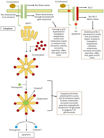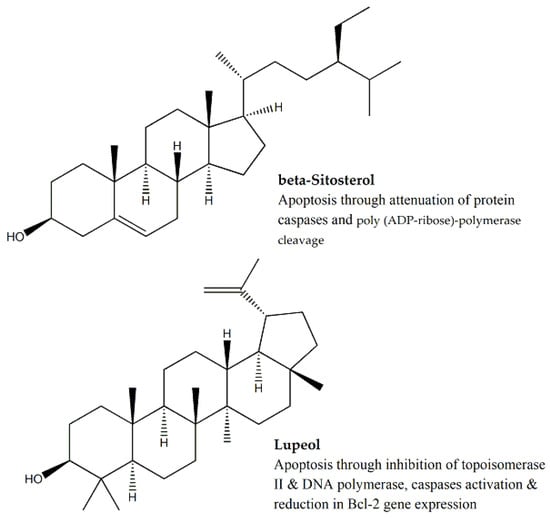 Again, the petroleum ether fraction of H. calyphyllus extract (IC50 values were 14.5 and 25.1 μg/mL against HepG2 and MCF-7, respectively) and the chloroform fraction of H. micranthus extract (IC50 values were 27.6 and 24.1 μg/mL against HepG2 and MCF-7, respectively) had the most potent cytotoxic effect [67]. Both extracts were then analyzed with HPLC for the quantification of the aforementioned biomarkers. Among the three biomarkers, the apoptotic effect of ursolic acid was reported to be mediated by cytochrome c-dependent caspase-3 activation, inhibition of DNA replication through topoisomerase I cleavage, and increase in the expression of p21WAF1 cell-cycle regulator [68]. β-Sitosterol induced apoptosis via caspase-3, caspase-9 activation and poly (ADP-ribose)-polymerase cleavage. In addition, reduction in anti-apoptotic Bcl-2 protein expression and increase in pro-apoptotic Bax protein expression were reported [69]. The cytotoxic effects of lupeol were attributed to the inhibition of topoisomerase II, DNA polymerase, angiogenesis, and induction of apoptosis through caspases activation, poly (ADP-ribose)-polymerase cleavage, and decreased Bcl-2 expression [70].