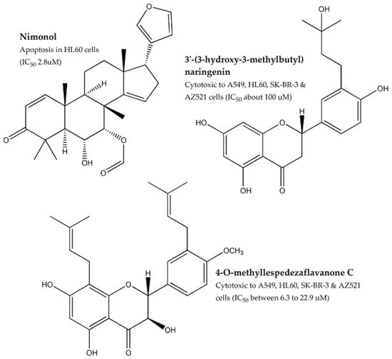 Azadirachta indica, an important medicinal plant found on the Indian subcontinent, was evaluated for its cytotoxic effect against HT-29, A-549, MCF-7, HepG-2, MDBK, and EAC cell lines (IC50 values: 83.5–212.2 μg/mL) [71,72]. Multiple cytotoxic triterpenoids, limonoids (tetranortriterpenoids), and flavonoids were isolated from A. indica, and their cytotoxic effects have been reported in numerous studies. One study reported the isolation of 17 limonoids (including three new compounds) and assessed them for cytotoxic potential against lung (A549), leukemia (HL60), breast (SK-BR-3), and stomach (AZ521) cancer cell lines. Seven compounds exhibited significant cytotoxic potential (IC50 values: 0.1–9.9 μM). Among them, nimonol (Figure 9) induced apoptosis in HL60 cells (IC50 value: 2.8 μM) [73]. In another study, 36 limonoids were isolated (including six new compounds) and the anti-tumor potential was evaluated against the aforementioned cell lines (IC50 0.1–9.3 μM). Sixteen compounds were reported to induce apoptosis in AZ521 cells [74,75]. In addition, two new flavonoids, 3′-(3-hydroxy-3-methylbutyl) naringenin and 4′-O-methyllespedezaflavanone C (Figure 9), and seven known flavonoids were isolated from the plant and were found to be potentially cytotoxic against A549, HL60, SK-BR-3, and AZ521 cell lines (IC50 4.2–100 μM) [76]. Furthermore, two new terpeniods, isolated from A. indica, were found to be cytotoxic against A549, HL60, SW-480, SMMC7721, and MCF-7 cells (IC50 values: 0.8 to 4.5 μM) [77].
