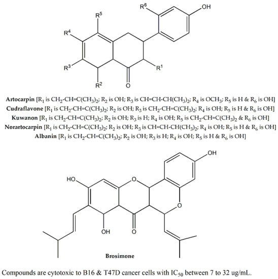- Arung, E.T.; Yoshikawa, K.; Nakagawa, T.; Kondo, R. Isoprenoid-substituted flavonoids from wood of Artocarpus heterophyllus on B16 melanoma cells: Cytotoxicity and structural criteria. Fitoterapia 2010, 81, 120–123. [Google Scholar] [CrossRef]