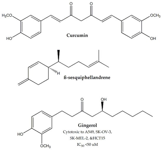- Kim, J.S.; Lee, S.I.; Park, H.W.; Yang, J.H.; Shin, T.-Y.; Kim, Y.-C.; Baek, N.-I.; Kim, S.-H.; Choi, S.U.; Kwon, B.-M.; et al. Cytotoxic components from the dried rhizomes of Zingiber officinale Roscoe. Arch. Pharmacal Res. 2008, 31, 415–418. [Google Scholar] [CrossRef] [PubMed]