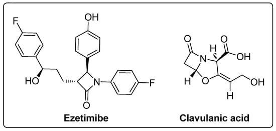 Among the heterocyclic compounds, the four-membered cyclic amide ring system of β-lactams has evolved as the scaffold of choice in the design of many antibiotics and it is also a valuable building block in organic synthesis. It is recognized as a vital component for the bioactivity profile of antibiotics [41,42,43,44,45]. A range of conjugates with diverse pharmacological applications can be synthesized by incorporating the β-lactam structure as a key scaffold or utilizing it as an important building block for the synthesis of a variety of bioactive heterocycles [46,47]. Besides antibiotics, β-lactams have other clinical applications, for example, clavulanic acids are β-lactamase inhibitors and ezetimibe is a cholesterol absorption inhibitor (Figure 2) [48,49]. These diverse applications have drawn attention to the further development of the β-lactam ring and several protocols have been devised to synthesize four-membered ring β-lactams. Currently, research in this area has been stimulated due to the development of bacterial resistance to known β-lactam antibiotics.