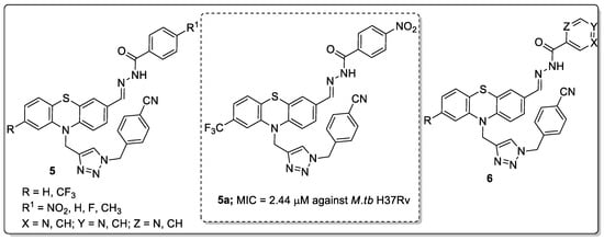 Phenothiazine conjugates 5 and 6 with a 1,2,3-triazole linker were developed and the conjugates screened for anti-tubercular activity against Mycobacterium tuberculosis H37Rv strain [57]. All the compounds exhibited relatively good in vitro anti-tubercular activity as demonstrated by the compound 5a bearing a 4-nitro group that showed significant anti-tubercular activity with a MIC value of 2.44 μM against M.tb H37Rv (Figure 8). Compound 5a also displayed non-toxic characteristics against VERO cell lines. The isonicotinohydrazide/nicotinohydrazide derivatives 6 exhibited moderate activity with MIC values ranging from 2.61–2.94 μM against M.tb H37Rv. A SAR study revealed that the substituted phenyl rings, instead of the isonicotinohydrazide/ nicotinohydrazide resulted in highly potent activity, which was dependent on the substituents’ electronic effect on the phenyl ring. The active compound was comfortably docked into the Inh A and Cyp121 enzymes. Compound 5a was exhibited distinct hydrogen bonding formation and pi-pi interactions with the hydrophobic residue Tyr158 of the Inh A enzyme. The most potent compound displayed higher permeability and aqueous solubility values than the respective analogs. In addition to, the pharmacokinetic parameters suggested that the compound exhibits good oral bioavailability. The potent compound signified a novel hybrid for the development of potential anti-tubercular agents.
