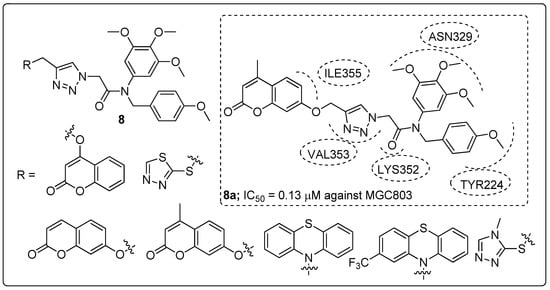 1,2,3-Triazole-linked trimethoxyphenyl scaffolds 8 were prepared and screened for antiproliferative activity against prostate (PC3), liver (HepG2) and gastric (MGC803) cancer cell lines [59]. Among the synthesized hybrids, the coumarin moiety allied to a 1,2,3-triazole (compound 8a) exhibited promising antiproliferative activity (IC50 = 0.13 μM) against the MGC803 cell line (Figure 10), compared with the standard drug colchicine (IC50 = 0.27 μM). Replacement of the coumarin moiety with a phenothiazine ring and were observed decreased activity. Compound 8a could inhibit MGC803 cell growth and colony formation. It caused cell cycle arrest at the G2/M phase and tubulin polymerization was sturdily inhibited by correlating with the colchicine site. Furthermore, when the hybrid 8a was validated by molecular docking studies it was found that the 3,4,5-trimethoxyphenyl ring, 4-methoxyphenyl ring, and the amide group formed three hydrogen bonding with the Asn329, Tyr224 and Lys352 residues at the active site of tubulin. These results revealed that coumarin with 1,2,3-triazole hybrids are potent colchicine site tubulin polymerization inhibitors.