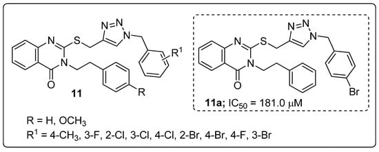 A series of quinazolinone hybrids 11 with a 1,2,3-triazole linker were reported by Saeedi and co-workers and the hybrids evaluated for their in vitro α-glucosidase inhibitory activity [62]. All the screened hybrids exhibited good inhibitory activity with IC50 values ranging from 181.0–474.5 μM compared with the reference acarbose with an IC50 value of 750.0 μM (Figure 13). Compound 11a substituted with 4-bromobenzyl moiety exhibited highest α-glucosidase inhibitory activity (IC50 = 181.0 μM). SAR studies revealed that weak inhibitory activity was found when fluorine and chlorine atoms substituted the benzyl moieties unlike with the bromo compound 11a. A slightly reduced activity was observed when the bromine atom was substituted on the ortho and meta-positions of the benzyl ring. Furthermore, by molecular docking studies in the active site of α-glucosidase, the quinazolinone moiety of hybrid 11a was shown to form a hydrogen bonding and a π–π interaction with His279, and the phenethyl group and sulfur atom interacted with Arg312 residues. Hydrophobic interactions between Pro309 and the 1,2,3-triazole ring were also observed. Moreover, the 4-bromobenzyl group showed two interactions with Val305 and Val316 through the 4-bromo substituent and a hydrophobic interaction with Pro309 through the phenyl ring. Quinazolinone linked 1,2,3-triazole hybrids are potential conjugates for the treatment of antidiabetic activity.
