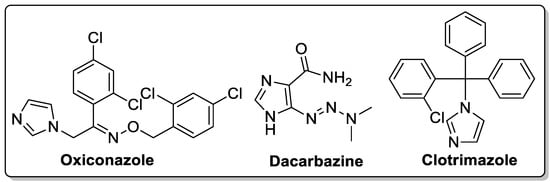 The unique structural features of the five-membered imidazole and benzoimidazole moieties distinguish them as important heterocycles and these structures are part of many natural products and synthetic compounds. The electron-rich nature of the imidazole-based derivatives is useful to freely bind with various receptors and enzymes in the biological profile, thus showing broad biological activities [65,66]. Several imidazole-based molecules (oxiconazole, dacarbazine, and clotrimazole) exhibiting antifungal and anticancer activities with high therapeutic potency are clinically used as drugs (Figure 16). The scope of imidazole- and benzoimidazole-based molecules increasing rapidly in medicinal chemistry.