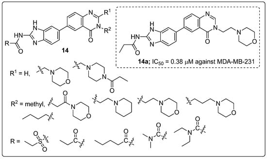 Benzoimidazole-quinazolinone hybrids 14 were synthesized and tested the molecules for their cytotoxicity and Aurora-A kinase inhibitory activity by MTT assay [67]. All the tested hybrids showed good cytotoxicity activity, with IC50 values ranging from 0.38 to 18.13 μM against three cancer cell lines namely breast cancer (MDA-MB-231), prostate cancer (PC3) and neuroblastoma (SH-SY5Y) (Figure 17). Among them, the morpholinoethyl compound 14a displayed excellent activity with an IC50 value of 0.38 μM (MDA-MB-231), 1.09 μM (PC3) and 0.77 μM (SH-SY5Y). Compound 14a also showed promising inhibitory activity (IC50 = 21.94 μM) against Aurora-A kinase. In addition to, compound 14a displayed induced G2/M phase cell cycle arrest and cell apoptosis via Aurora-A kinase inhibition. The replacement of the morpholinoethyl moiety with a methyl group might decrease the anticancer activity. Moreover, an extended propenamide alkyl side-chain at position 2 of the benzimidazole or an increased steric hindrance due to the introduction of a macrocyclic substituent may diminish the anticancer activity. Also, the replacement of propenamide with an electron-withdrawing group ethyl sulfonamide significantly reduced the anticancer activity. Furthermore, molecular docking studies revealed that the binding mode of compound 14a formed hydrogen bonding interactions with the amino acid residues Ala213 in the kinase hinge region, the main chain NH of Thr217 and the catalytic lysine of Lys162. The quinazolinone fragment formed hydrophobic interactions including π-π stacked and π-alkyl interactions with different residues including Leu139, Ala160, Leu194, Leu210, Ala213 and Leu263 of Aurora-A. The benzoimidazole-quinazoline hybrids are promising candidates for the progress of potential anticancer agents.
