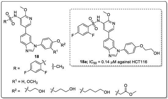 A library of 1,6-disubstituted-1H-benzo[d]imidazole derivatives 18 was synthesized and the derivatives tested for their in vitro antiproliferative activity against the T47D, HCT116 and MCF-7 cancer cell lines [71]. Among them, the compound 18a with a 2,4-difluoro substitution pattern on the sulfonyl phenyl ring showed significant activity, with IC50 values of 0.36, 0.14 and 0.31 μM against the T47D, HCT116 and MCF-7 cancer cell lines, respectively (Figure 21).