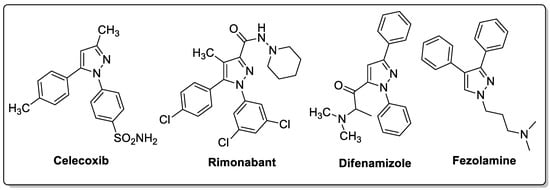Pyrazole is a well-known five-membered nitrogen-based heterocycle and exhibits a broad spectrum of synthetic and biological applications. Several pyrazole-based drugs namely celecoxib, rimonabant, difenamizole and fezolamine, etc., with excellent anti-inflammatory, anti-obesity, analgesic and/or antidepressant activities have been developed and are used to treat various diseases (Figure 23) [32,33,34,35].
