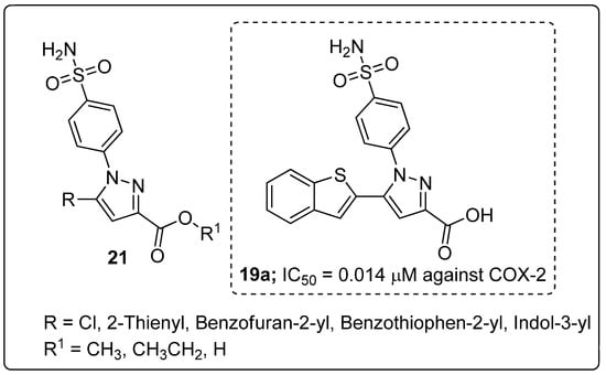 Pyrazole sulfonamide conjugates 21 were prepared and evaluated for their in vitro analgesic and dual COX-2/5-LOX inhibitory activity [74]. The pyrazole derivative with a benzothiophene (conmpound 21a) exhibited potent inhibitory activity with the IC50 values of 5.40 μM (COX-1), 0.014 μM (COX-2) and 1.78 μM (5-LOX) (Figure 25). Compound 21a showed equal or more potent analgesic activity (88.8% protection) than the standards indomethacin (84.4%) and celecoxib (31.1%), with no gastric ulcerogenic properties.