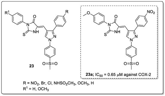Pyrazole-linked thiohydantoin derivatives 23 were synthesized and tested for their anti-cancer and anti-inflammatory activities [76]. Among them, the nitro substituted compound 23a showed high anti-inflammatory activity (IC50 = 0.65 μM) against the COX-2 enzyme as compared with celecoxib (IC50 = 0.84 μM) (Figure 27). The compound exhibited significantly less ulcerogenic activity (ulcer index = 3.21) than the non-ulcerogenic celecoxib as the reference drug (ulcer index = 2.99). In addition to that, a series of compounds were evaluated for their cytotoxic activity against lung carcinoma (A-549), colon (HCT-116) and breast (MCF-7) cancer cell lines. The same compound 23a exhibited the most potent cytotoxic activity (IC50 = 3.73 μM) against the human colon (HCT-116) cancer cell line. Compound 23a inhibited human topoisomerase-1 (Topo-1) with an IC50 value of 29.7 μg/mL, as compared with the reference camptothecin (IC50 = 20.2 μg/mL). The methoxy-substituted derivative has higher cytotoxic activity than the respective unsubstituted derivatives. Furthermore, the binding mode of the active compound 23a with COX-2 and human topoisomerase-1 enzyme was investigated by docking studies. Compound 23a interacts via hydrogen bonding with Tyr341, Tyr371, Ser516 residues of COX-2. Also, there is a hydrogen bonding interaction with the Asp533 and two π-π stacking interactions with DNA base pairs through arene-arene interactions with deoxyadenosine DA113 of the human topoisomerase-1 enzyme. It can be concluded that for these types of analogs, the presence of a para-substituted methoxy in addition to the COX-2 pharmacophore SO2CH3 is important for binding with both COX-2 and human Topo-1. The pyrazole-thiohydantoin derivatives are promising candidates for the development of anti-inflammatory and anti-cancer agents.