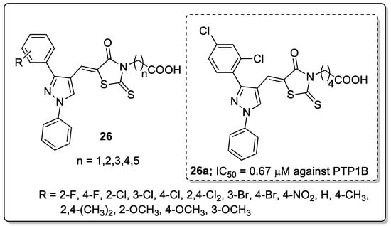 - Sun, L.; Wang, P.; Xu, L.; Gao, L.; Li, J.; Piao, H. Discovery of 1,3-diphenyl-1H-pyrazole derivatives containing rhodanine-3-alkanoic acid groups as potential PTP1B inhibitors. Bioorg. Med. Chem. Lett. 2019, 29, 1187–1193. [Google Scholar] [CrossRef]