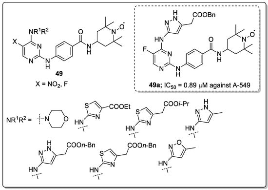 - Ma, Y.Z.; Tang, Z.B.; Sang, C.Y.; Qi, Z.Y.; Hui, L.; Chen, S.W. Synthesis and biological evaluation of nitroxide labeled pyrimidines as Aurora kinase inhibitors. Bioorg. Med. Chem. Lett. 2019, 29, 694–699. [Google Scholar] [CrossRef] [PubMed]