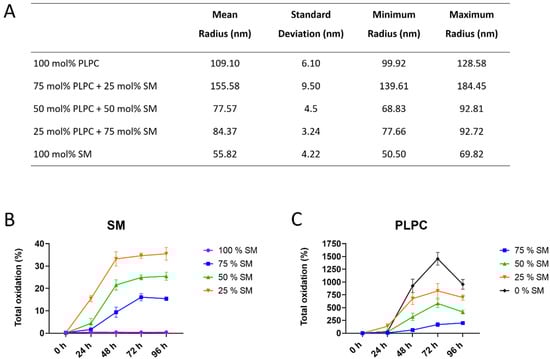 To monitor the effect of SM content on lipid peroxidation, liposomes with different ratios of SM and PC lipids were created, characterized, and used for in vitro oxidation. Formation of tightly ordered membranes with decreased surface area due to the H-bond formation was previously reported for SM-rich liposomes [30,31]. As expected, liposomes with highest SM fraction had the smallest radius (56 nm for 100 mol% SM liposomes) which gradually increased with lowering SM content (109 nm for 100 mol% PC liposomes; Figure 1A).