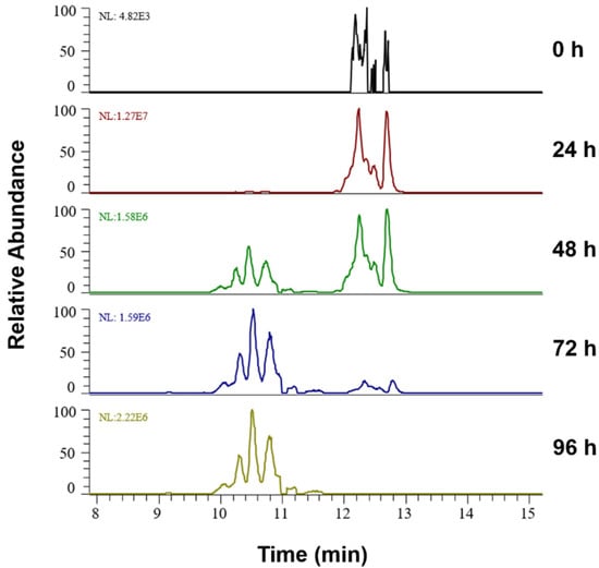 Extracted ion chromatograms for the signal at m/z 790.5598+ (±5 ppm; PLPC+2O) in liposomes containing 75 mol% SM over the oxidation time from 0 till 96 h, represented by two isomeric LPPs—dihydroxy (RT 10–11 min) and hydroperoxy (RT 12–13 min) PLPC.