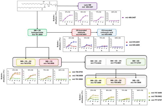 Among SM-derived LPPs, mono-oxygenated species (hydroxy(epoxy) and keto derivatives) were the most abundant, reaching up to 15.5% and 13.3% in liposomes containing 25 mol% SM, respectively (Figure 3). As it was shown above, LPP abundance as well as the formation rate showed clear dependence on the molar ratio between SM and PC lipids. Thus, abundance of hydroxy(epoxy)- and keto-SM in liposome with 75 mol% of SM corresponded only to 6.1% and 6.9%, respectively. A similar trend was observed for dihydroxy-, diketo-, and keto-hydroxy(epoxy)-SM LPPs, although present at much lower amounts. SM oxidation products formed by truncation at C9 of oleic acid (corresponding aldehyde and carboxylic acid) as well as lyso-derivative formed by the loss of fatty acyl chain were identified and quantified as well. However, their impact, although reproducing the trend for negative correlation of LPP abundance with SM content, was negligible (below 1% relative to unmodified SM).
