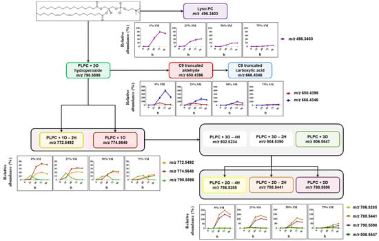 For a more detailed view on the process of lipid peroxidation and LPP formation in liposomes of different compositions, the relative abundance of analyzed LPPs was plotted over the exposed time for each liposome composition. Moreover, optimized RP chromatography allowed to separate isomeric species, such as hydroperoxides and dihydroxy-derivatives of PLPC.