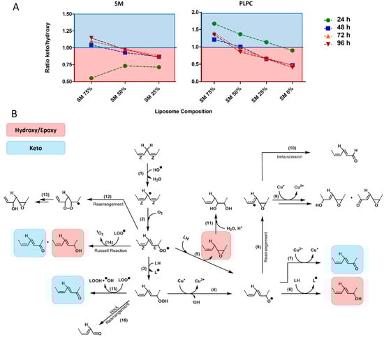 Ratio of keto to hydroxy(epoxy) mono-oxygenated SM and PLPC as a marker of lipid peroxidation propagation. (A) Calculated ratio for keto/hydroxy(epoxy) SM- and PLPC-derived LPPs in liposomes with different SM content illustrated for 24, 48, 72, and 96 h post oxidation induction. (B) Proposed pathways of free radical driven lipid peroxidation described for mono- and di-unsaturated fatty acids in the presence of transition metals. Mono-oxygenated keto- and hydroxy(epoxy)-derivatives are highlighted (blue and red, respectively).