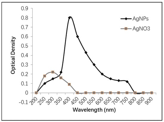 UV-Vis spectroscopy is considered a simple, quick, and sensitive technique for investigating the formation of silver nanoparticles, which could be observed through the change in color from light yellow to dark brown [26,27]. The spectrophotometric analysis of the prepared silver nanoparticles was performed using a wide range of scanned wavelengths (200–900 nm). As shown in Figure 2, the highest absorbance was observed at over 400 nm, indicating the presence of silver nanoparticles. However, silver nitrate solution showed an absorbance peak at 300 nm that completely disappeared after the formation of silver nanoparticles. These data are almost matched with those of Ibrahim et al., who showed that the silver nanoparticles absorb the visible spectra at 409 nm accompanied the disappearance of the silver nitrate peak that was shown at 300 nm. Furthermore, previous studies reported that the peaks of UV absorption of silver nanoparticles could be in the range of 400–450 nm [28,29], which is in agreement with the data of the current study.
