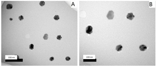 Transmission electron microscopy (TEM) micrographs of silver nanoparticles at (A) low (100,000×) and (B) high magnifications (200,000×).