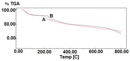 Thermogravimetric analysis (TGA) curves of (A) k-carrageenan and (B) k-carrageenan with silver nanoparticles.