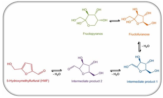Polovková and Šimko [23] detected HMF levels by high performance liquid chromatography supported with a diode array detector (HPLC-DAD) at 284 nm, and their findings showed the presence of HMF in 25 kinds of brown sugar, 15 kinds of which had HMF values that ranged from 0.17 to 6.45 mg/kg, while 13 kinds of white sugar had zero HMF. The authors attributed the occurrence of HMF in brown sugar to a lack of refining or as a result of adding treacle during the production process. These results were compatible with a previous study, where values of HMF in sugar-containing products were estimated and recorded (10.9–16.4, and 12.3–23.3 mg/kg) for light- and dark-brown sugars, respectively. The mechanism of HMF formation from simple sugars is illustrated in Figure 2.