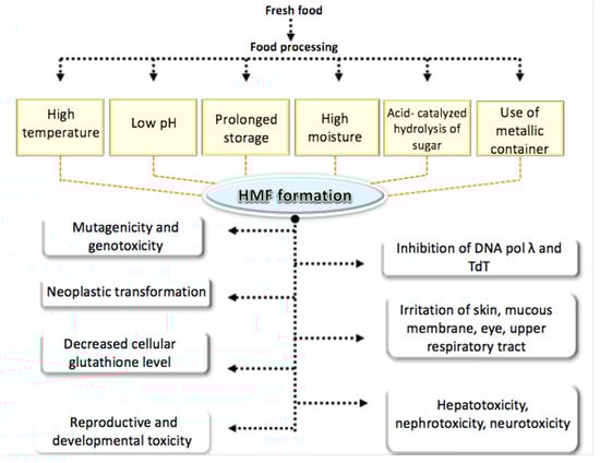 Several studies have reported various adverse effects of HMF on human health as described in the following sections and summarized in Figure 3.