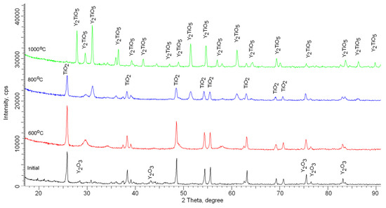 The preparation of nanostructured ceramics was carried out using the solid-phase synthesis method by mixing salts of yttrium nitrite (YN3O9·6H2O) and titanium oxide (TiO2) in an equal stoichiometric ratio of 50:50. The chemical purity of the salts was 99.999%, manufactured by Sigma Aldrich. After intensively mixing the suspended salts in an agate mortar to obtain an isotropic composition, carbon nanotubes (СNT) were added to it at a concentration of 10% of the total mass of the sample. The resulting mixture, after mixing and adding carbon nanotubes, was annealed in an oxygen-containing medium in a muffle furnace at a temperature of 600–1000 °C for 5 h, followed by cooling together with the furnace to reduce the risk of a sharp temperature difference. The choice of temperatures is based on phase transformations due to thermal heating. It should be noted that, as a rule, the processes of phase transformations begin to manifest themselves most vividly at temperatures of 0.2–0.5 Tmelting (for TiO2 Tmelting = 1843 °C, for Y2O3 Tmelting = 2425 °C). Doping with carbon nanotubes leads to an acceleration of phase transformations, which is due to the low melting temperature Tmelting = 1180 °C. Also, in the case of an increase in the annealing temperature, partial annealing of defects occurring during the synthesis, as well as phase transformations, is observed, as evidenced by changes in the symmetry of the diffraction peaks for the annealed samples.