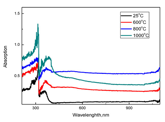 The study of the absorption spectra of the studied nanostructured ceramics was obtained using the UV spectroscopy method using a Jena Specord-250 BU analytical spectrophotometer equipped with an integrating sphere. BaSO4 was used as the standard. The resolution is 1 nm, and the scanning speed was 20 nm/s. The spectral range is 190–1100 nm.