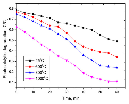 The photocatalytic ability of the synthesized nanostructured ceramics as a function of annealing temperature was studied by evaluating the decomposition of methyl orange in an aqueous solution with a given initial concentration of 25 mg/L, as a result of exposure to UV radiation with a lamp power of 4.5 mW/cm2. Assessment of the degree of degradation was carried out by measuring the UV–vis spectra at different time intervals. Figure 6 shows graphs of changes in photocatalytic degradation.