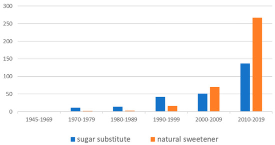 Number of publications with the topic “sugar substitute” and “natural sweetener” according to the Web of Science citation indexing service (core collection) from 1945 to 2019.