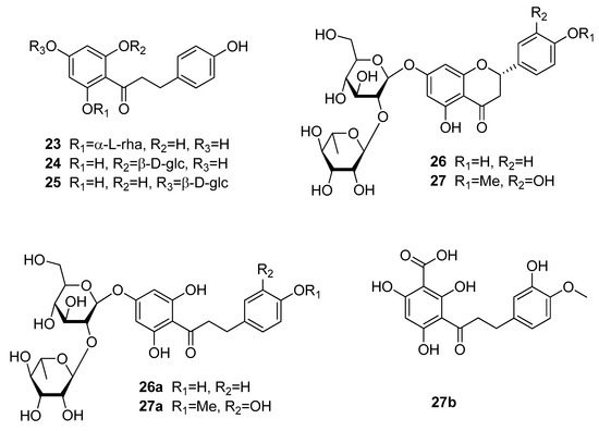 The class of dihydrochalcones contains three semi-synthetic high potent sweeteners (26a, 27a, and 27b), though their precursor molecules are ranging from slightly sweet (23–25) to even bitter molecules (26 and 27) (Figure 7). Compounds 23 to 25 are naturally occurring dihydrochalcones, so-called phloretin derivatives. The first of these compounds, glycyphyllin (23) was isolated from Smilax glycyphylla (Smilaccaceae), which is meanwhile named Smilax leucophylla, and was reported to have a bittersweet taste, similar to that of licorice [11]. Phlorizin (24) was obtained from Symplocos lancifolia (Symplocaceae), while trilobatin (25) was isolated form Symplocos microcalyx, a species with an unresolved taxonomic status [52,53].