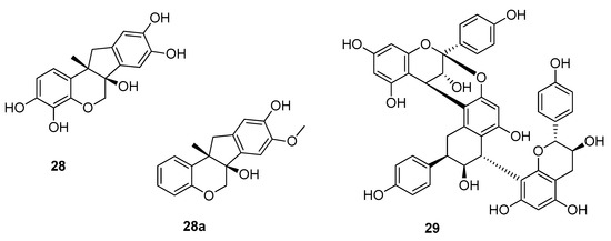 The last class of phenolic compounds to be discussed consists of two condensed phenols (28 and 29) and one synthetic analog (28a) (Figure 8). The first compound is (+)-haematoxylin (28), a constituent of Haematoxylum campechianum (Fabaceae) and shows an RS value of 120 compared to a 3% (w/v) sucrose solution [58]. To improve the sweetening effect a synthetic analog was prepared, which displayed an isovanillyl feature on one of the two aromatic rings. However, the relative sweetness did not alter significantly, now showing an RS value of 50 for the racemate.