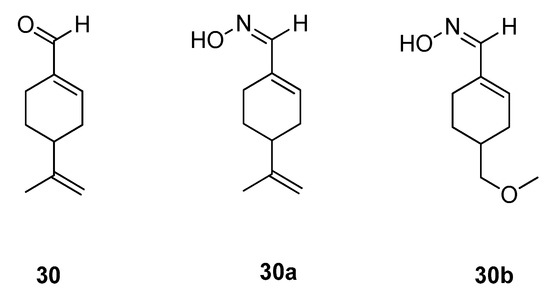 The class of monoterpenes, so far, only yielded one natural sweetener, which is perillaldehyde (30) (Figure 9). The compound is the sweet principle of perilla oil, which is obtained by distillation of Perilla frutescens (Lamiaceae) [11]. The compound itself, same as the oil, only shows a slightly sweet taste, but the respective syn-oxime, perillartine (30a) possesses a RS of about 370 to that of sucrose (5) [11,60,61]. However, perillartine (30a) has an appreciable bitterness and a low water solubility, thus restricting its use for many applications [61]. Further studies focusing on perillartine analogs yielded compound 30b, which showed an improved RS of 450 times to that of sucrose (5) coupled with superior water solubility [61].