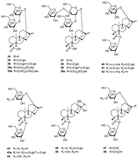Another series of kauran-type glycosides (43–48) was isolated from Rubus suavissimus (Rosaceae), which is now classified as Rubus chingii var. suavissimus [73,74]. Rubusoside (43) was found to have a RS of about 115 time that of sucrose (5), but a slightly bitter aftertaste. Semi-synthetic modification of rubusoside with a maltotriosyl moiety (43a) increased the RS and at the same time reduced the bitter taste [75]. Unfortunately, RS values of the other glycosides were not obtained. However, only those compounds with glucose moieties in positions 13 and 19 were found sweet, namely suaviosides B (44), G (45), I (46), H (47), and J (48) [74].