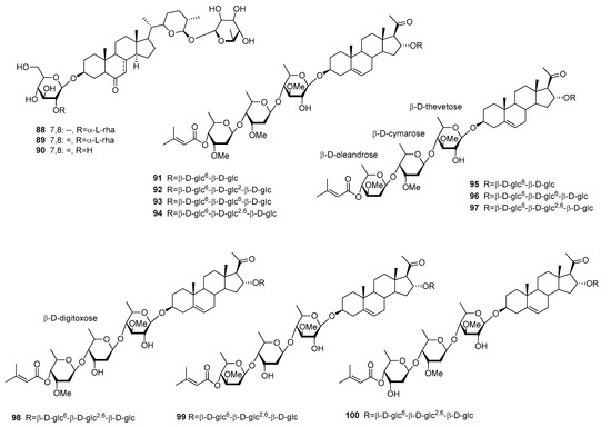 The last compound class to be discussed in this review are sweet-tasting steroids (88–100) (Figure 16). Investigation of two fern species of the Polypodiaceae family, namely Polypodium vulgare and Polypodium glycyrrhiza yielded compounds osladin (88) as well as polypodiosides A and B (89–90) [94,95,96]. Osladin (88) and polypodioside A (89) were both found to be potent sweeteners, with RS values of 500 and 600, respectively. However, their poor availability coupled with low water solubility and a licorice aftertaste minimized their commercial potential [12].