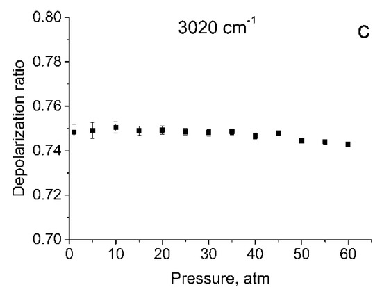 An analysis of the depolarized spectra showed that the peak in the region of 2916–2917 cm−1 increases with pressure, as shown in Figure 3. This peak belongs to ν1 band. We estimated changes in the integrated intensities in the range of 2888–2938 cm−1 for polarized and depolarized spectra at different pressures. For this purpose, intensities at each pressure (IP) have been converted into intensities corresponding to the densities of molecules at 1 atm () using Equation (2):